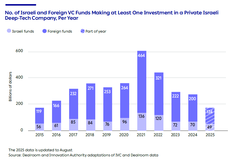In recent years, the number of active investors in Israel’s deeptech sector has been in decline. In 2023-2024, about 280 different venture capital funds invested in at least one Israeli deep-tech company. In 2025 (up to August), around 170 funds made at least one investment in Israeli deep-tech companies. These figures are relatively low compared to 2017-2022, when an average of 400 funds invested in Israeli deep-tech companies each year. It should be noted that the figures for the most recent years are still expected to be updated upward.