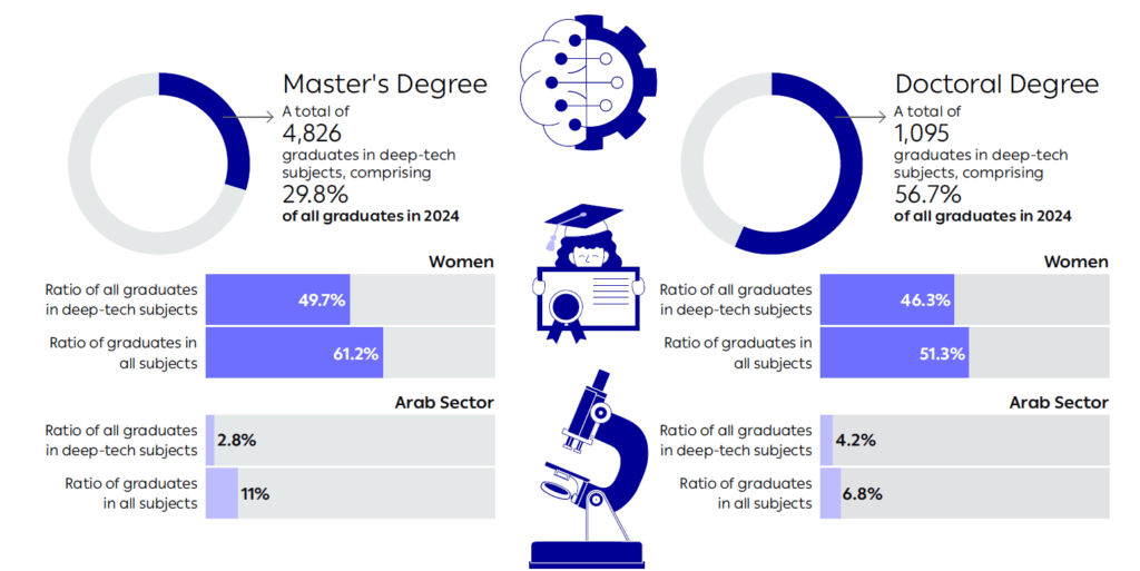 By contrast, the ratio of graduates from the Arab sector is significantly lower than their proportion of the general population. While the Arab population constitutes about 21% of Israel’s total population, only 2.8% of master’s degree graduates in deep-tech subjects are Arab. Their ratio of doctoral graduates is only slightly more encouraging, with approximately 4.2% of graduates in deep-tech subjects coming from the Arab sector.