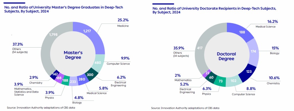The data reveals that the number of graduates with advanced degrees in deep-tech subjects has been rising consistently for more than a decade, at a pace exceeding that of the population’s growth. The data further shows that about 6,000 students completed advanced degrees in deep-tech subjects in 2024, accounting for roughly one third of all advanced degree graduates. Of these, around 5,000 completed a master’s degree and 1,000 a doctorate. One third of the graduates were in medicine and biology, and another 20% in computer science, electrical engineering, and mathematics.