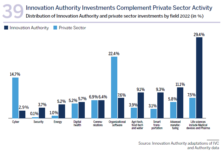 At the same time, the Authority’s investments in the fields of cyber and organizational software stand at 10.5% compared to 37.1% of private market investments. 2The Authority has difficulty in classifying fintech companies, and we therefore refrain from presenting a comparison in relation to this field. Nevertheless, it is worth noting that the experience accumulated by the Innovation Authority indicates that the Authority’s investments in this field are negligible. As noted above, these fields are characterized by a perfect capital market and numerous venture capital investors that specialize in them. If so, why does the Innovation Authority invest in them at all? This is the place to mention that reality is, as always, complex. A narrow view of a company’s area of activity generally fails to tell the whole story, and there may be companies that develop innovative high-risk technologies specifically in fields typified by significant capital. For example, the Authority may receive requests from cyber companies developing quantum technology-based solutions – a new and high-risk field. In addition, although startups developing technologies in the field of Generative AI that is directed, for example, at the field of organizational software, operate in a field popular with investors, the disruptive technology they develop is still high-risk. In this reality, whereby a new technology is on the cusp of breakthrough, it is important to preserve Israel’s comparative advantage in the fields of software.