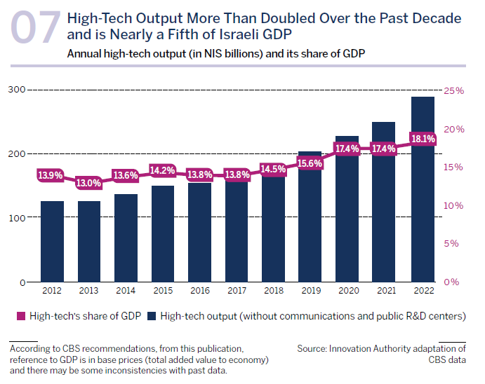 High-tech constituted 18.1% of Israel’s GDP in 2022 – a figure that positions it as the sector with the largest output in the economy.1According to CBS recommendations, from this publication, reference to GDP is in base prices (total added value to economy) and there may be some inconsistencies with past data. From 2012, high-tech’s share of GDP increased by more than four percent (from 13.9%). In comparison, in the US, which has a large and developed high-tech sector alongside a more diverse economy, high-tech’s share of GDP in 2021 stood at 9.3%.2Source: Tech GDP as a percent of total U.S. GDP 2021 | Statista. In other words, high-tech’s relative share of Israeli GPD is almost double that in the US, a figure that dramatically illustrates Israel’s high dependency on this sector.