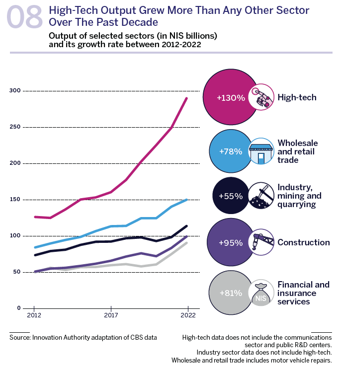 The growth in high-tech output is especially marked when compared to the growth in outputs of other sectors in the Israeli economy over the past decade. For example, the output of the high-tech sector in 2012 was 50% higher than that of the trade and retail sector – the next sector in size after high-tech. A decade later in 2022, the gap between the two sectors stood at more than 90%, i.e., high-tech output is becoming increasingly dominant in comparison to the other sectors in the private market. Of the economy’s main sectors, high-tech output is the only one to have doubled, or more, over the past decade.