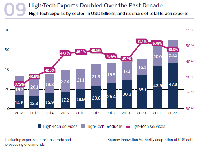 The Israeli high-tech sector was responsible for 48.3% of all Israeli exports in 2022, totaling 71 billion dollars, more than doubling over the last decade and growing by 107%. This growth stemmed almost entirely from the increase in exports of high-tech services that include, among others, software services. This export more than tripled from the 2012 level of 14.6 billion dollars to 47.8 billion dollars in 2022. During the same period, exports of high-tech commodities that include the microchips sector, grew by only 18%. Between 2016-2020, exports of high-tech commodities declined but increased again over the last two years. After the ratio of high-tech exports out of total Israeli exports crossed the 50% threshold during the Covid crisis, its relative share declined in 2022 due to the general recovery of the economy and the increase in other sectors such as tourism that were negatively impacted during the pandemic.