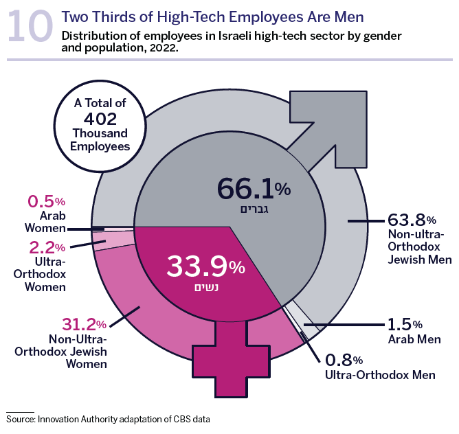 Human capital is the primary resource of Israeli high-tech and the one which attracts technology companies and investors from around the world to Israel. In total, 401,900 salaried employees worked in the Israeli high-tech sector in 2022.3The recommendations of the National High-Tech Human Capital Committee (the Perlmutter Committee) include a new definition of “tech jobs” – people employed in high-tech and in technology jobs in other sectors. See: The Committee’s Recommendations (in Hebrew). In this section, we examine the high-tech sector according to its previous definition which refers exclusively to employees in this sector. A “tech jobs” based analysis is presented in a separate text box. Although significant resources were invested in diversification and inclusion, and despite an increase in the rate of diverse population groups integrating into a variety of roles in the sector (see details below), Israeli high-tech still largely consists of (non-ultra-Orthodox) Jewish men. 66% of salaried high-tech employees are men and 34% are women.