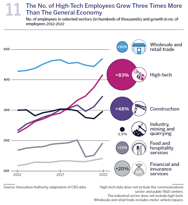Moreover, high-tech is almost the only industry in the private sector in which the growth in employees was not impacted by the Covid pandemic, in contrast to most of the private sector industries that witnessed a downturn and a decline in the number of employees.