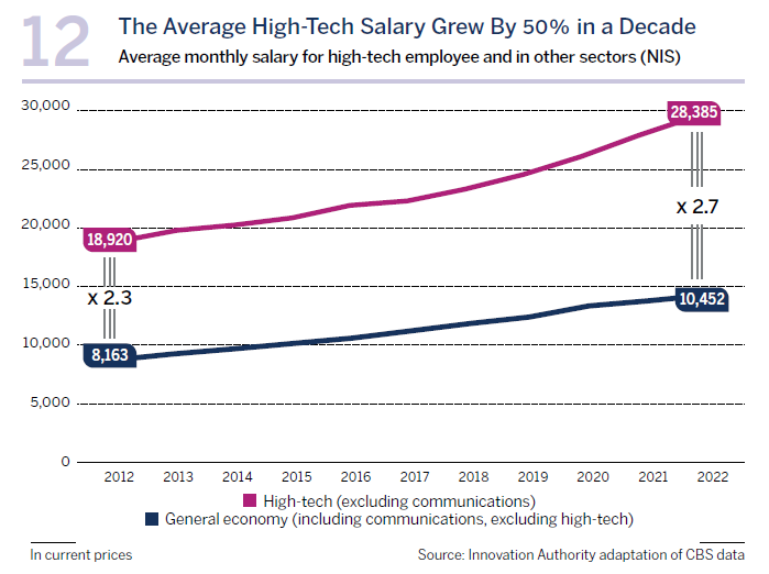 For several decades, the average salary in high-tech has been (at least) double that of the economy’s average salary. In 2012, high-tech salaries were 2.3 times higher than the general economy’s average salary. Together with sector’s accelerated growth described above during the past decade, and the fierce competition between the companies over human capital – the primary factor in attracting the world’s leading technology companies to Israel – salaries in this sector also surged. The average yearly growth rate of high-tech salaries between 2012-2022 stood at 4.14% compared to 2.5% in the rest of the economy. In recent years, the yearly salary growth rate accelerated and stood at an average of 5% a year between 2018-2022.