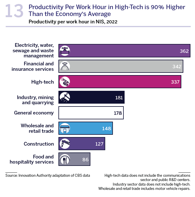 The second largest sector in terms of hourly work productivity is financial and insurance services which, for the first time, overtook high-tech productivity in 2022, reaching 343 shekels last year. This figure stems primarily from the banks’ profits, the sector’s high degree of centralization, and a lack of competition. Nevertheless, in recent years, as part of economization processes in the financial sector, there has been a marked growth in the number of technology workers hired in this sector who also have contributed to the increased productivity. Over the past decade, the productivity of financial services employees increased by more than 50%, compared to 29% in high-tech. If the growth rate of the financial services sector over the last three years is maintained, we may see this gap in productivity increase even further.