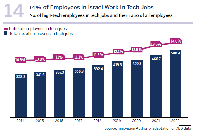 According to the new and expanded definition, The data presented here differs slightly compared to the definition adopted by the Perlmutter Committee and relates to salaried employees of all ages, and not just to employees aged 25-64. there were 508,400 salaried employees in high-tech and technology roles in 2022 – comprising 14% of all salaried employees in Israel. In 2014, this figure stood at 10.6% (a total of 328,300 employees) i.e., the relative share of salaried employees in tech jobs recorded a significant increase of 32%. These figures highlight the importance of high-tech jobs in their broader definition to the economy, as they increasingly attract more and more employees.