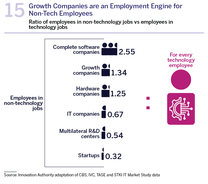 Approximately 60% of the employees in the high-tech sector, work in companies with a medium-low employment multiplier that are part of multinational development centers, IT companies, and high-tech companies that manufacture tangible products (hardware). The growth companies, which employ over 20% of the sector’s personnel, employ an average of 1.34 non-technology employees for every engineer and constitute high-tech’s primary employment engine as they progress to becoming complete companies.[16]