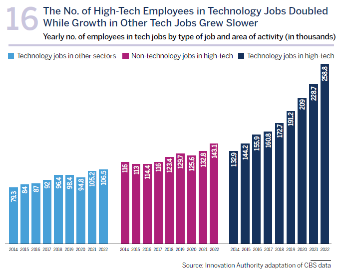 An analysis of employees according to job type reveals a clear picture: most of the growth in the number of high-tech employees in recent years stemmed from the growth in technology jobs and not in the (non-technology) growth jobs. While in 2014 the number of salaried employees in technology jobs in the high-tech sector stood at 133,000, the number of employees in non-technology jobs was 116,000. In other words, there was an employee in a non-technology job for nearly every employee in a technology job. In 2022, the number of employees in technology jobs in the high-tech sector had almost doubled and stood at 259,000. During the same period, the number of employees in non-technology jobs in the high-tech sector increased by only 23%. In other words, in 2022, there was only half an employee in a non-technology job for every employee in a technology job – a decline of 50% in the multiplier in less than a decade.