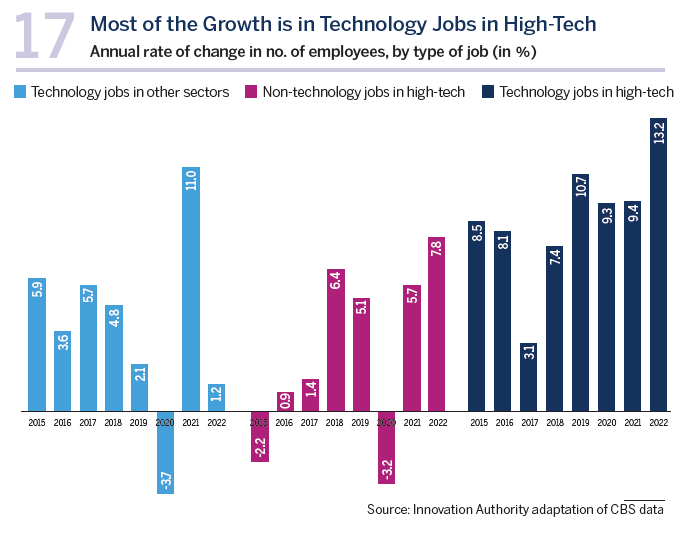Furthermore, an analysis of the annual growth rate according to each of the job types and sectors shows that there was positive growth in the number of salaried employees in technology jobs in high-tech in each of the years examined (2014-2022). In contrast, the (non-technology) growth jobs in high-tech and the technology jobs in the general economy fluctuated and, in some of these years, even declined. For example, in the Covid pandemic year of 2020, there was a decline in the number of employees in these jobs. In other words, these jobs are more sensitive to market turbulence. Moreover, of the three job categories, the fastest growing category is that of technology jobs in high-tech which is growing faster than technology jobs in the rest of the economy and non-technology jobs in high-tech. In recent years (2019-2022), the growth rate of technology jobs in high-tech was four times higher than that of technology jobs in the economy at large, and 2.5 times higher than growth jobs in high-tech.