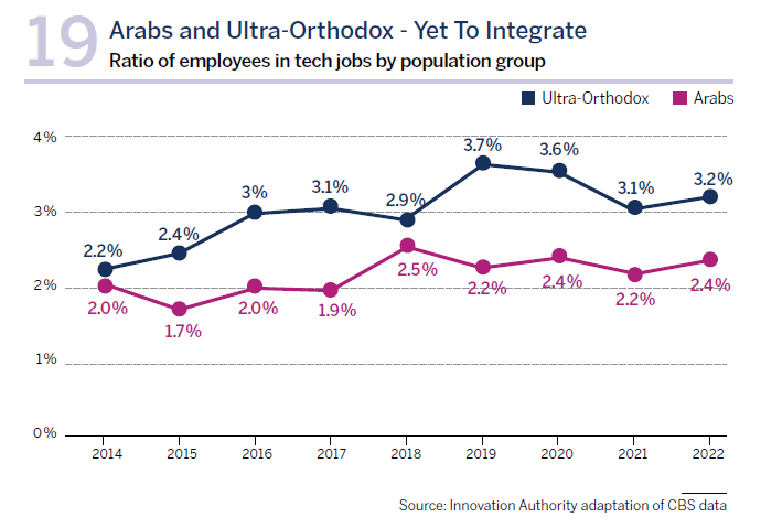 Progress in integrating Arabs and the ultra-Orthodox into high-tech is very slow. In 2014, 2% of the salaried employees in high-tech were from Arab society and 2.2% from ultra-Orthodox society. In 2022, the Arab sector’s representation in high-tech had risen by just 0.4% to 2.4%. In contrast, the ultra-Orthodox society is still underrepresented in high-tech but is growing at a quicker rate and its share of all salaried employees in high-tech and in technology jobs in the economy at large had increased to 3.2%. The growth was naturally led by ultra-Orthodox women who are joining high-tech at a rapid rate although their number is still relatively low and in 2022 totaled less than 11,500, after having tripled since 2014. In comparison, the number of non-ultra-Orthodox Jewish women was 149,000 in 2022. The number of ultra-Orthodox men in all jobs in high-tech was 5,000, and their growth rate since 2014 was about a quarter of that of ultra-Orthodox women.