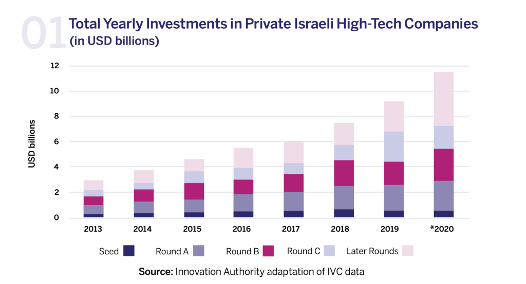 Investments in Israeli startups totaled USD 11.5 billion in 2020 – four times the level of only a decade previously.1According to IVC data. In 2020, the average and median size of Israeli technology companies’ funding rounds grew by 10% and 8%, respectively. Nevertheless, most of the growth in Israeli startup investments stemmed from an increase in late-stage funding rounds, some startups raising unprecedented amounts of several hundred million dollars in every round. Cyber and FinTech were the sectors of Israeli startup attracting the most investment in 2020, raising capital of USD 2.9 billion and USD 1.7 billion, respectively.