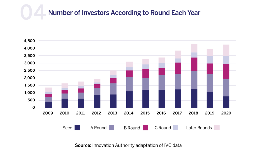 A closer examination of early-stage funding rounds reveals a decline in the number of investors taking part in these rounds in the past two years, especially in the seed stage. This finding, along with the ongoing stagnation in the number of seed rounds presented above, has led the Authority to launch its ‘Hybrid Seed’ program. The goal of this program is to increase the number of potential investors involved in the seed stages, to increasingly focus the R&D Fund’s resources on early-stage funding of accelerator companies, and to encourage quality investors to participate in earlier stages via the Angels Law that will be discussed below.