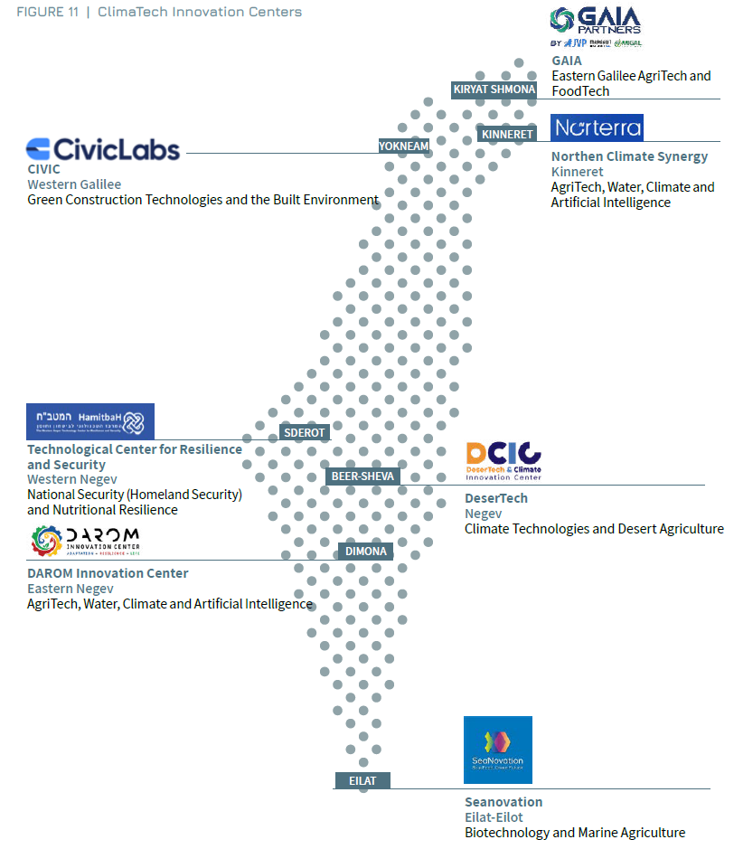 - Innovation Centers: in order to promote entrepreneurship in Israel’s peripheral areas, the government initiated a $27.6 million program to establish nine innovation centers across the country, 8 of them in Climate related themes, promoting high tech solutions for a range of topics such as foodtech, renewable energy, built environment, agriculture, and more.
