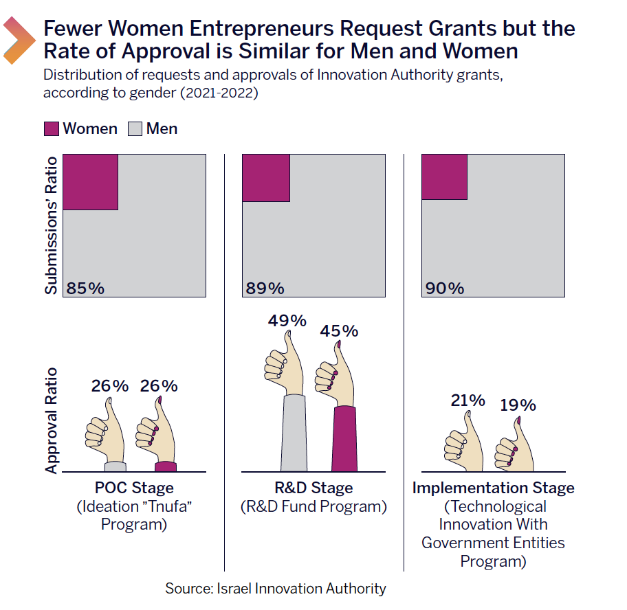 In 2019, the Israel Innovation Authority began offering a benefit designated specifically for women entrepreneurs, as part of the R&D Fund (that constitutes the Authority’s primary investment tool and budget activity). This benefit aimed at assisting women raise funding, encouraging women entrepreneurs to submit requests for grants, and help them raise supplementary funding from additional entities. According to the terms of this benefit, women entrepreneurs in R&D stages will be eligible for support of 70%-75% of the approved development budget, compared to 30%-50% for male entrepreneurs who receive the grant. Moreover, the Authority offers women preferential conditions in other areas such as the Support for Seed Companies Program in which women entrepreneurs can receive a grant of up to 50% of the submitted budget compared to 40% for male entrepreneurs, and in the Authority’s various training programs where a higher financial incentive is awarded for placing women.
