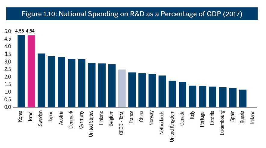 In the OECD R&D Intensity Index (R&D investment as a ratio of GDP), presented in Figure 1.10, Israel continues to hold a leading position, sharing first place with Korea, with its national spending on R&D being 4.5% of the GDP.