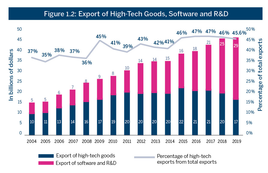 Figure 1.2 demonstrates that despite accelerated growth in software and R&D export, the export of high-tech goods (medicine, electronic and optical equipment, etc.) decreased by around 15%, continuing 2018’s trend. Figure 1.2 also shows that in 2019, the share of high-tech export from total export decreased slightly to 45.6%, following six years of over 46%.