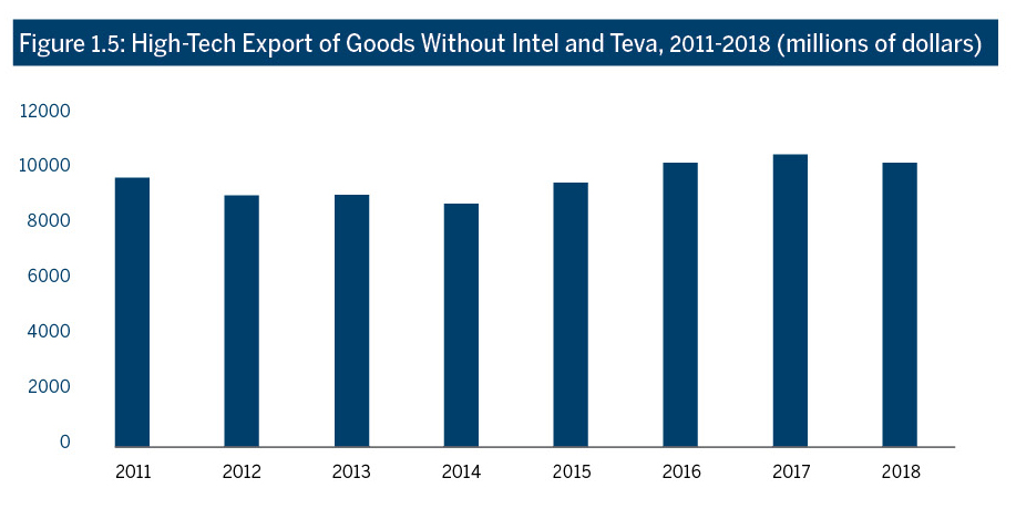 Figure 1.5 presents the export of high-tech goods without Intel and Teva. In 2017, the export of high-tech goods grew by about 2.9%, and in 2018 it shrank by almost 2.7%, indicating the decline is not a result of changes to these two specific companies.