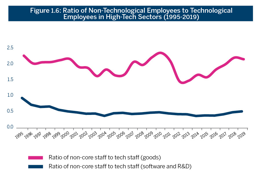 The contribution of the high-tech goods sector to broad employment – employment of more than just R&D employees – is evident in Figure 1.6, which depicts a 2:1 ratio of non-technological employees (finance, marketing, manufacturing, etc.) to technological employees in high-tech manufacturing companies, compared to a 1:2 ratio in software and R&D companies.