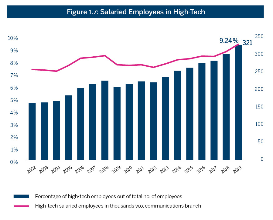 Figure 1.7 indicates that in 2019, the number of high-tech employees grew at a growth rate of 8.4%, to 321,000, up from 295,000 in 2018, and for the first time crossed the 300,000 threshold.7Data on 2019 was not yet published in full at the time of the publication of this report Also for the first time, the ratio of high-tech employees in the workforce exceeded 9%, and today stands at 9.2%.