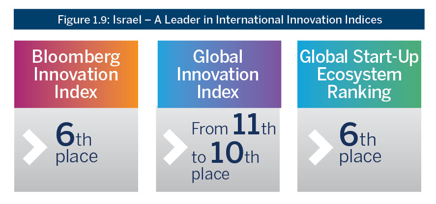 As seen in Figure 1.9, Israel is ranked 6th in Bloomberg’s Innovation Index,13The Annual Bloomberg Innovation Index, 2019 out of 95 countries went up from 10th to 11th place in the Global Innovation Index14Global Innovation Index 2019, out of 129 countries, and maintained its 6th place position in the Global Start-Up Ecosystem Ranking.15Start-up Genome report 2019, out of 150 ecosystems