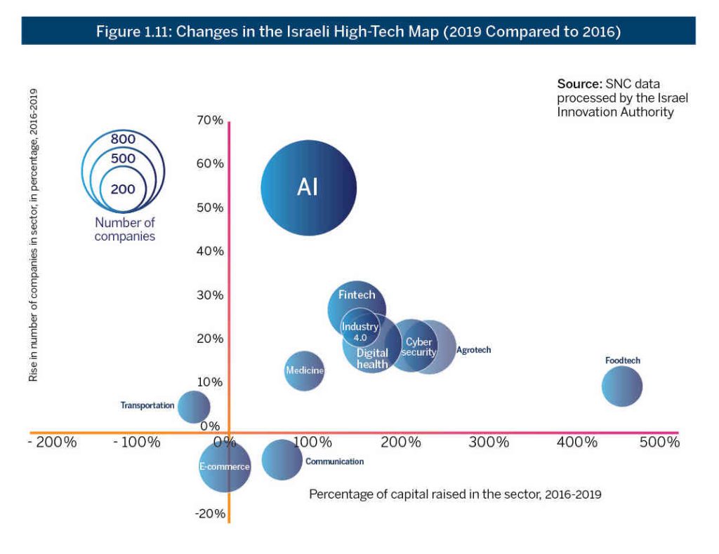 Figure 1.11 shows that AI has the most companies of any high-tech sector, and will be extensively covered in Chapter 5: ”Bolstering Artificial Intelligence – What Can Be Done for Israel to Maintain its Leading Position in the Field of AI?”. Israeli entrepreneurs’ ability to identify the potential in this field at an early stage and enter it quickly has made Israel a world leader in AI.