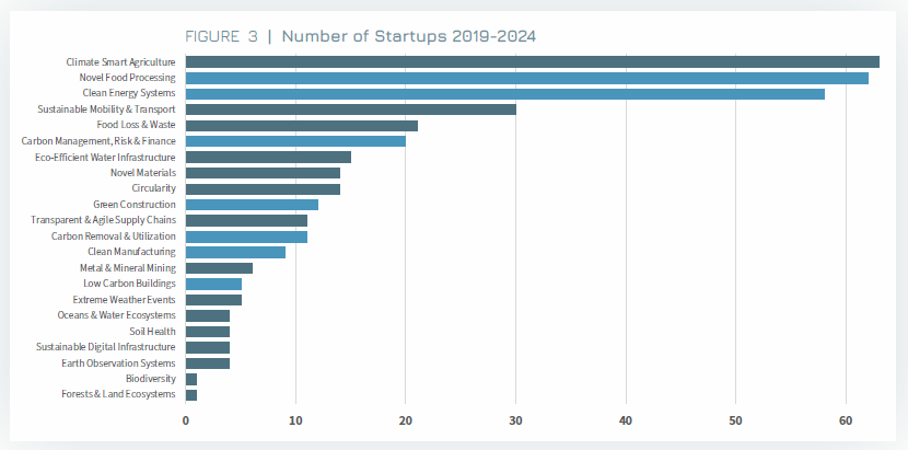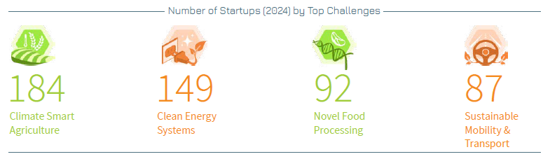 The five most prolific challenges addressed by startups remain consistent with those in the 2022 and 2023 Reports: Climate Smart Agriculture, Clean Energy Systems, Novel Food Processing, Sustainable Mobility & Transport and Eco-Efficient Water Infrastructure. These challenges are addressed by 184, 149, 92, 87 and 82 startups, respectively.