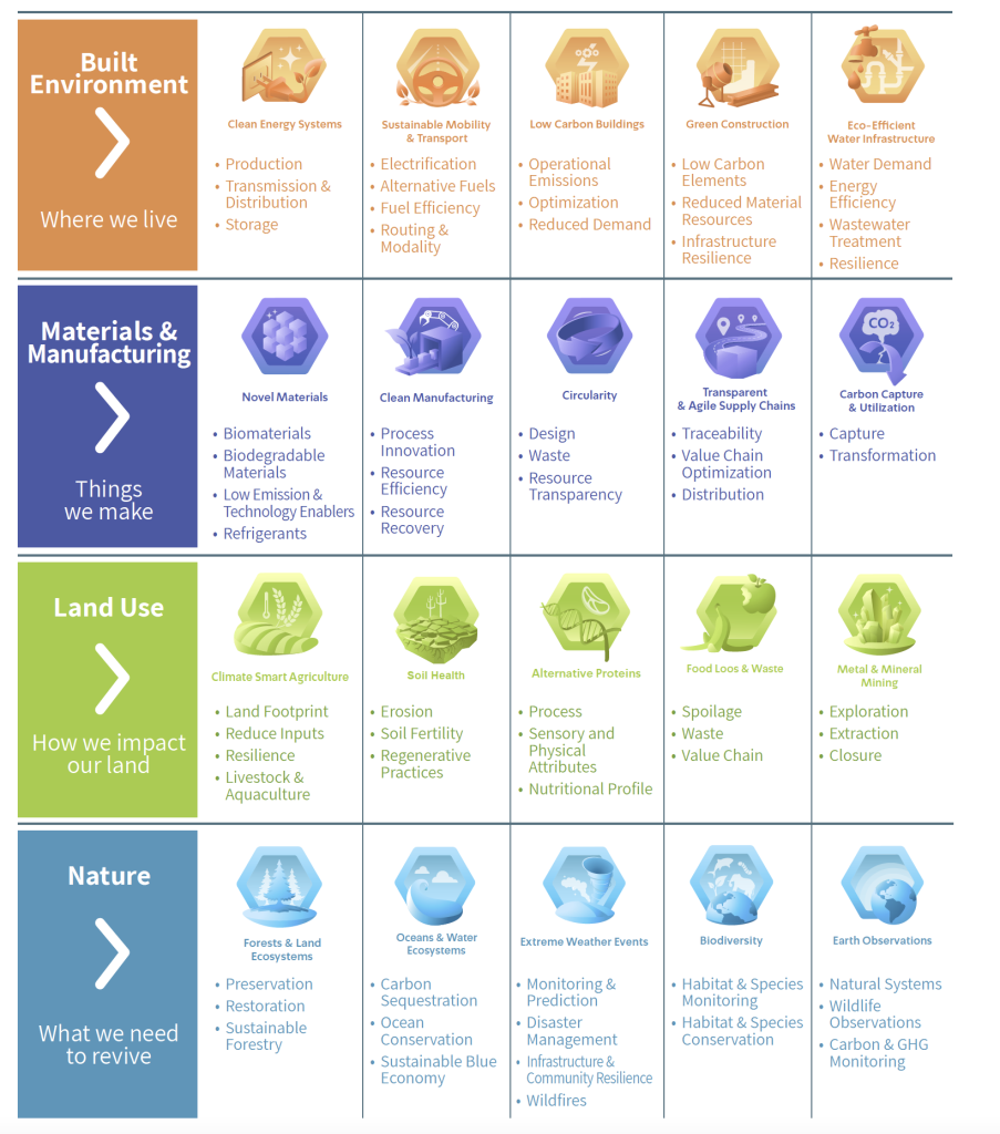 The PLANETech Climate Challenge Map presents the main challenges to successful climate change mitigation and adaptation, across all activities of our daily life and natural ecosystems. The climate challenges are associated with four main areas: The Built Environment, Materials & Manufacturing, Land Use, and Nature, each of which contain 5 explicit challenges – 20 challenges in total (Fig. 6). This entails a broad and all-encompassing approach rather than focusing on specific economic sectors and services. When focusing on challenges, solutions can be facilitated by innovations from varied technologies that target the areas listed below each challenge. The challenges target the reduction of emission sources, enhancement of carbon sinks, as well as community, nature, and infrastructure resilience.