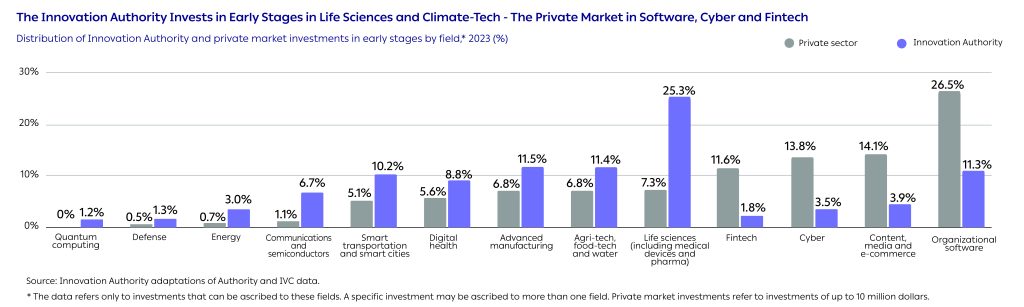 An analysis of the investments in startups funding rounds of up to 10 million dollars reveals that most of the early-stage investments in the private market are in the fields of software (26.5% of the investments up to 10 million dollars are in the field of organizational software). In contrast, state investments in hightech, implemented by the Innovation Authority, are primarily in the fields of life sciences and climate-tech. An examination of the distribution of the Innovation Authority’s investments vis-à-vis the private market’s investments in 2023 reveals that the Innovation Authority invests in fields in which the private market only invests to a small degree.