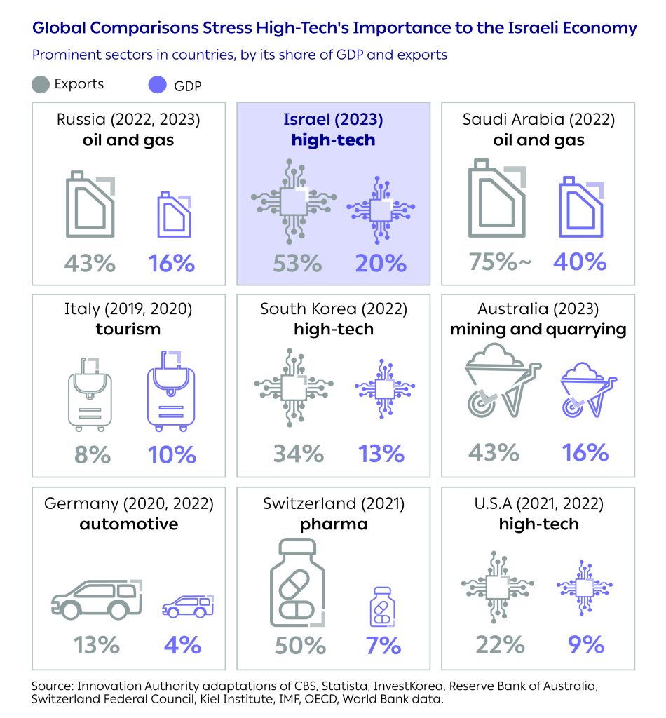 From a global perspective, high-tech’s centrality in the Israeli economy is a unique phenomenon. Its share of Israeli GDP – approx. 20% – is similar to that of natural minerals such as oil and gas in the economies of those countries that rely on them. High-tech’s share of Israel’s exports is also high and stands at more than 50% in recent years. In South Korea, for example, a country in which, like Israel, the investment in R&D as a ratio of GDP is extremely high, the high-tech sector accounts for 13% of GDP and a third of total exports. In the US, the home of the world’s leading technology hubs, the high-tech sector contributed less than 9% of GDP in 2022 and less than a quarter of total exports in 2021.