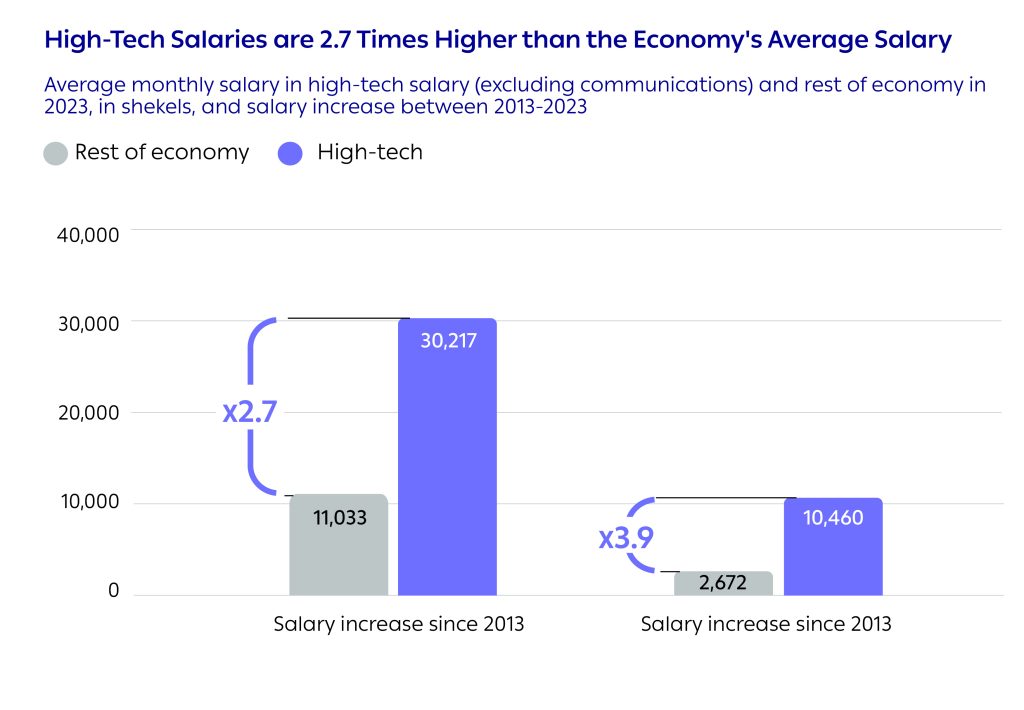 Broadly speaking, between 2013-2023, the average monthly salary in hightech rose by 10,460 shekels, an increase of 53%. In the rest of the economy, the average monthly salary rose by 2,672 shekels during the same period, an increase of 32%.