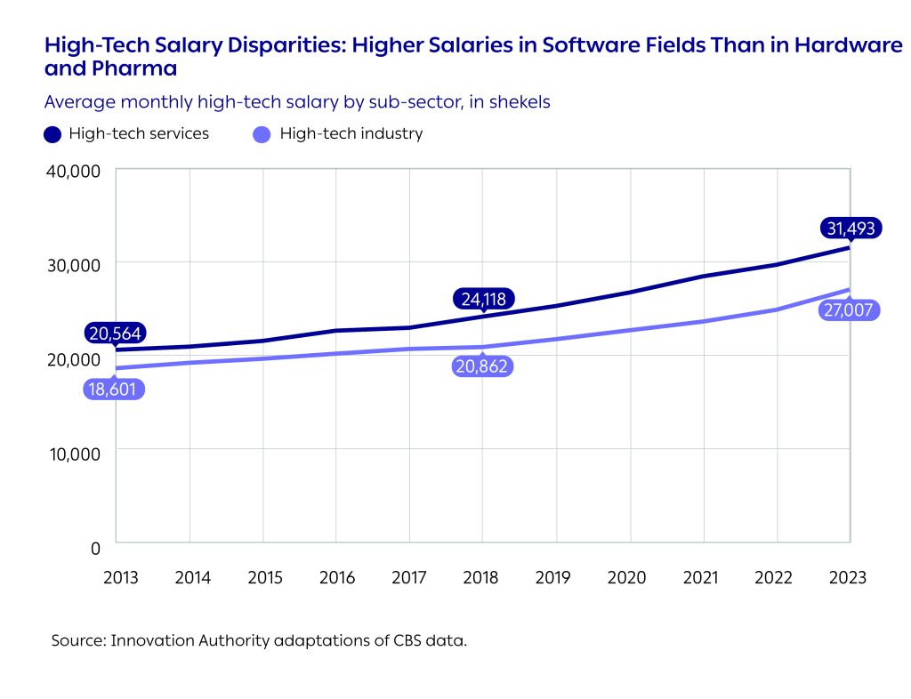 It should be noted that there are salary disparities within the high-tech sector. The average monthly salary in the high-tech services field (software) stood at 31,493 in 2023, compared to 27,007 shekels in the fields of high-tech industry (hardware and pharma). This disparity has grown steadily over the past decade from less than 2,000 shekels a month in 2013 to over 4,000 shekels in 2023.