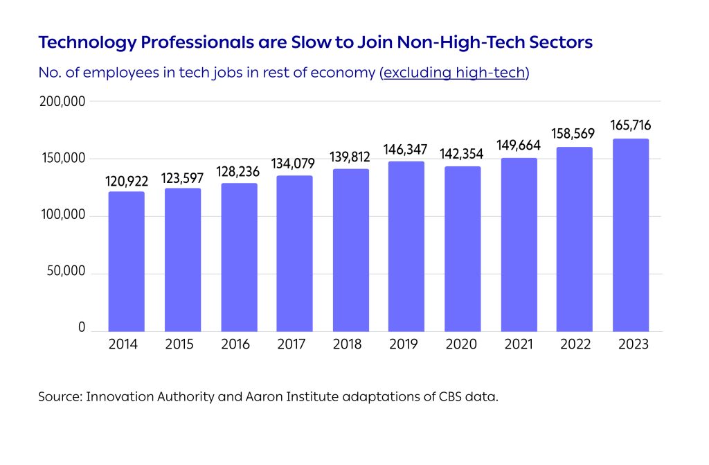 One significant way to expand high-tech’s success and reduce disparities in the economy is the integration of technological professionals in non-high-tech sectors (“tech jobs” as defined by the Perlmutter Committee). The number of workers in technology roles in non-high-tech sectors reflects, among others, the digital transformation they have undergone, the assimilation of innovation, improved productivity, their competitiveness vis-à-vis other companies in the sector, and the introduction of data-based decision-making processes.