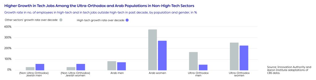 When examining the increase in the number of employees in technology jobs in high-tech and in the rest of the economy by population, it would seem that the technology jobs in the rest of the economy are opportunities for workers from populations under-represented in high-tech to enter high-quality employment and for the creation of inclusive growth. Over the past decade, the growth rates of Arab women, Ultra-Orthodox men, and, to a lesser degree, Ultra-Orthodox women were high in relation to their rate of joining the high-tech sector in the same period.