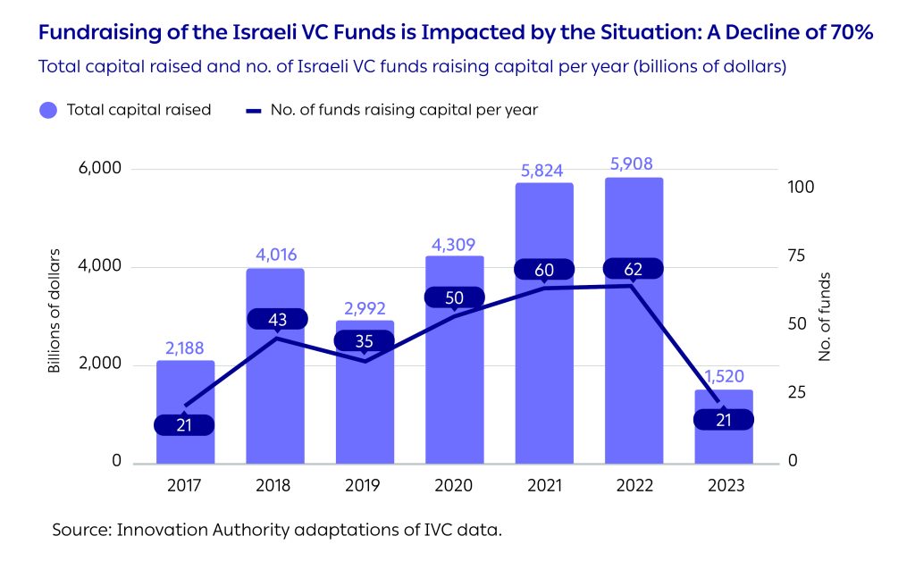 In 2023, the total sum raised by venture capital funds in Israel declined by 75% compared to 2022 and by 67% compared to the average raised in the period between 2018-2022.