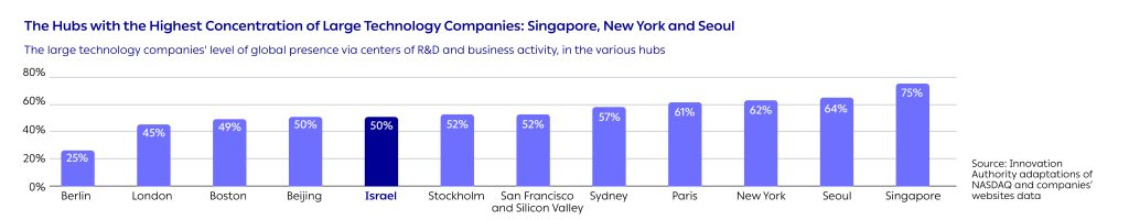 The study reveals that the places with the highest concentration of the largest multinational companies via R&D and business activity centers are not necessarily the largest hubs either in terms of investments in startups or local venture capital funds. The leading hubs in terms of large technology companies’ concentration are Singapore, New York, and Seoul. Furthermore, the study shows that the large technology companies’ level of presence in Israel is similar to that in Boston and Silicon Valley. Further discussion of the subject of competition for the presence of multinational companies in innovation hubs appears below in Issue no. 4.