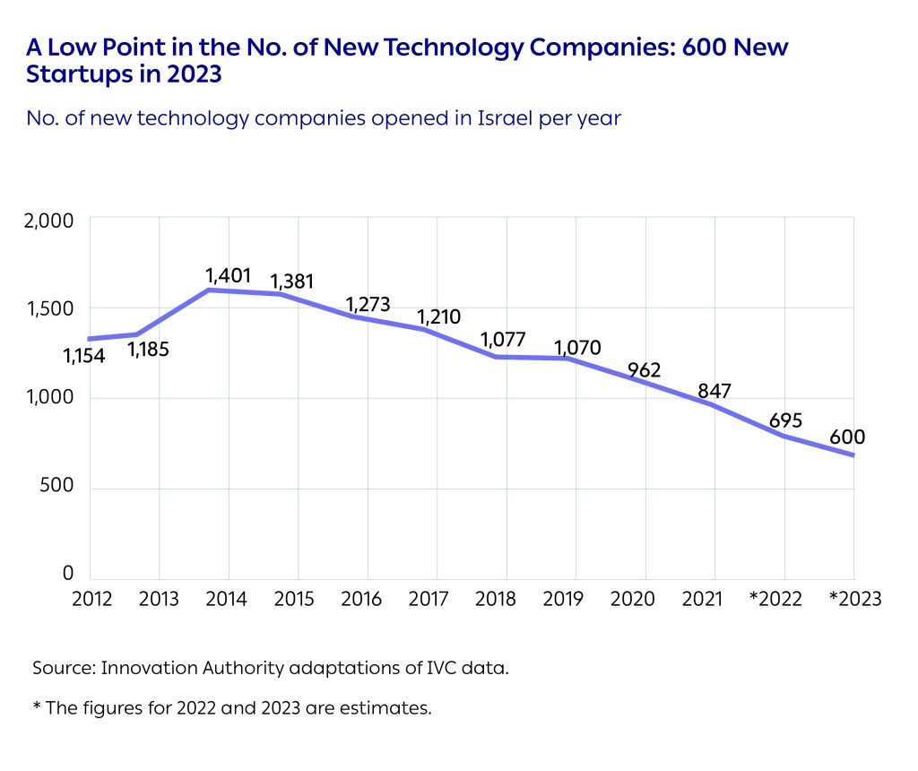 The first of these relates to technological entrepreneurship. Since its inception, Israeli high-tech has relied on groundbreaking innovation via young companies that engage in the development of high-risk technologies. One issue that will influence the sector’s future is related to the “crop” of Israeli startups. Since 2015, there has been a negative trend in the number of new startups established every year. The question arising in this context is if “enough” new technology companies are established each year or whether there is a threat to the future of the “startup nation”. According to a preliminary estimation, only 600 companies were established in 2023, a figure that constitutes a warning sign.2For further details ,see the Authority’s publication on this subject in conjunction with the RISE Institute )formerly SNPI(