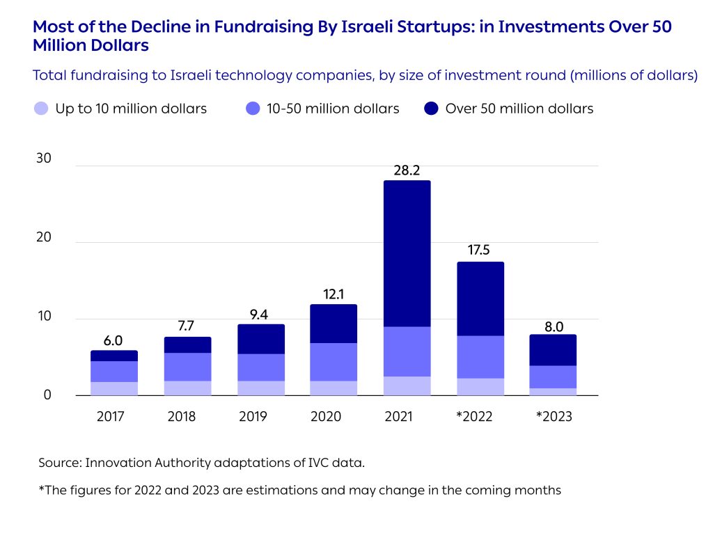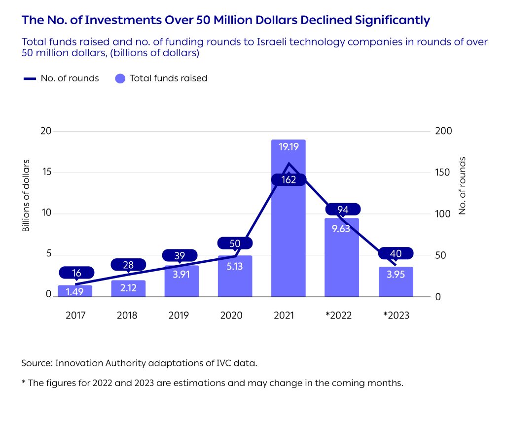 The average size of funding rounds over 50 million dollars in 2023 was similar to that recorded in previous years and stood at 98 million dollars. 2021 was an exceptional year in which the average size of the funding rounds over 50 million dollars stood at 118 million dollars. In other words, the decline was in the scope of deals in these stages, with the number of large funding rounds declining to a level similar to that of 2019.