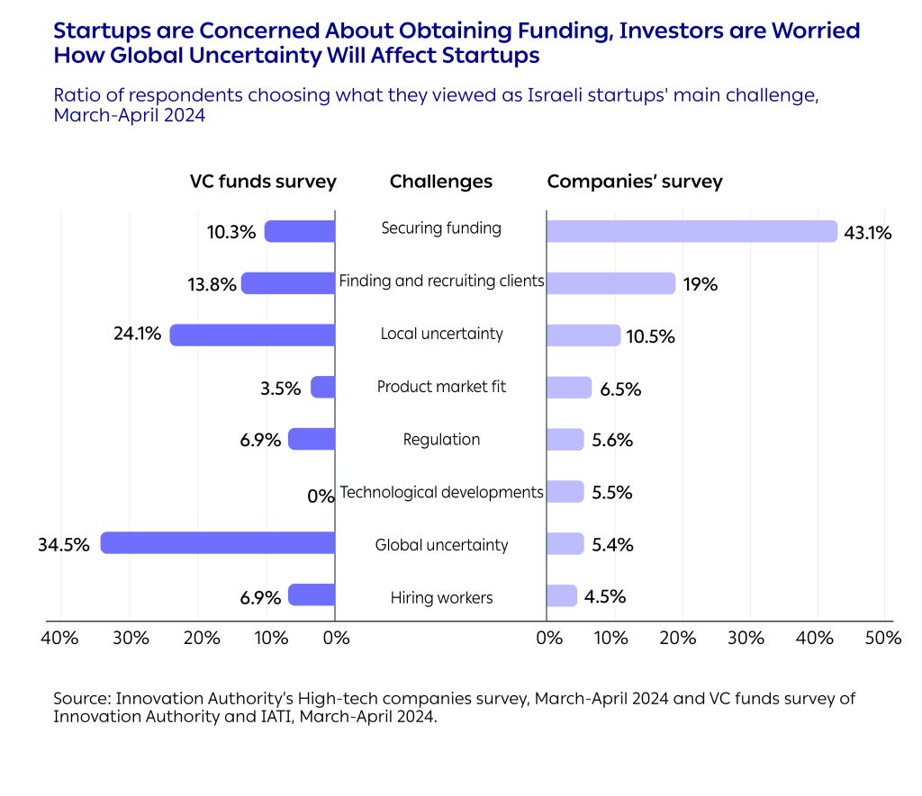 It is interesting to note the differences in the perceptions of investors and startups. Parallel to the companies’ survey conducted by the Innovation Authority in March-April, the Authority and IATI surveyed venture capital funds operating in Israel.3For details regarding the survey’s methodology ,see Appendix 1 When the investors were asked to rate the main challenges facing Israeli startups, 34.5% of them chose global uncertainty while 24% chose local uncertainty. Only 10% indicated securing funding as their main challenge even though this was rated first by the companies themselves. 14% chose the finding and recruitment of clients which was rated second by the companies. In other words, there is no correlation between the challenges as perceived by the companies and by the investors, with each group evaluating the current period’s main challenges differently.