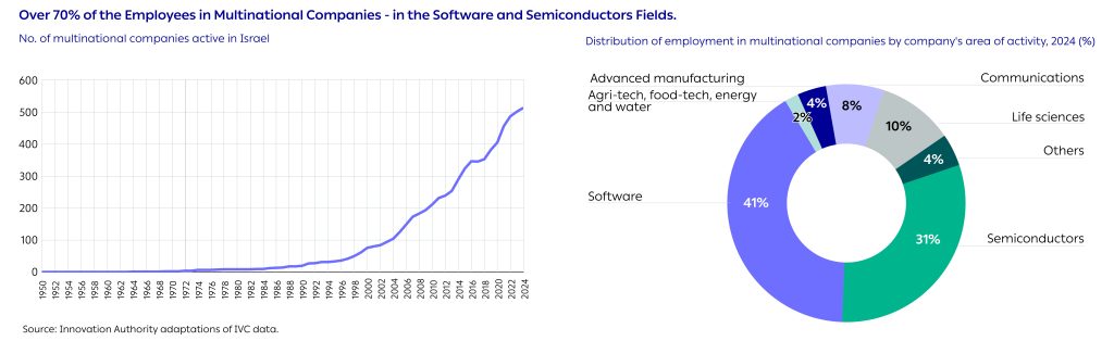 As of 2024, 515 multinational companies are operating in Israel, employing a total of nearly 90,000 people. The multinational companies in Israel currently operate in two main fields: software and semiconductors which account for 72% of the multinational companies’ employees. The field of life sciences comprises 10% of the multinational companies’ employees while 8% are employed in companies in the field of communications.