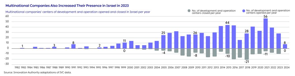 A further competitiveness index of the Israeli ecosystem, and in general of global innovation hubs, is the ability to attract multinational companies to host the operation of significant centers of activity and development. Over time, Israel has been the first place outside the US where a variety of companies have developed a center of activity. As of 2024, there are 515 multinational companies operating in Israel. Together with the growth of other global innovation hubs, competition is also increasing in this arena.