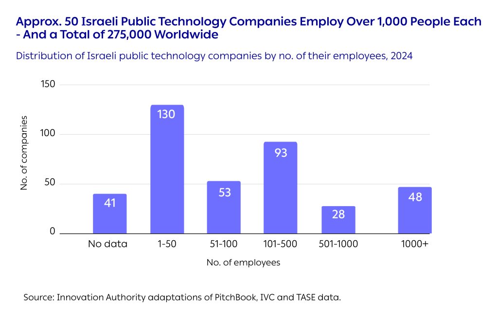 393 Israeli public technology companies are traded on global stock markets. Their cumulative market value, as of April 2024, is 234 billion dollars and they employ 320,000 employees worldwide. An analysis of the public companies according to the number of their employees reveals that already today, there are nearly 50 large Israeli public technology companies with over 1,000 employees which together employ a total of 275,000 people worldwide. The market value of these companies amounted to 184 billion dollars as of April 2024, approximately 79% of the total cumulative market value of all the Israeli public technology companies.