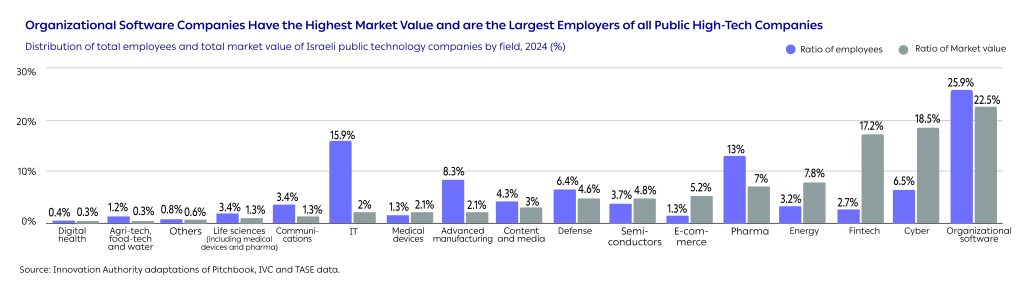 The main contribution of public technology companies to the economy stems from their employees and from the creation of circles of employment as a result of the companies’ local business activity. To encourage the growth of Israeli public high-tech companies, the state must encourage the companies to base as many of their organizational functions as possible in Israel. The diagrams below show that organizational software companies lead both in terms of market value and number of employees, in contrast to cyber and fintech companies which display a high market value but employ a relatively low number of workers. The formulation of government policy relating to high-tech investment must consider the employment potential of different fields, with an emphasis on employment in a variety of roles in Israel.