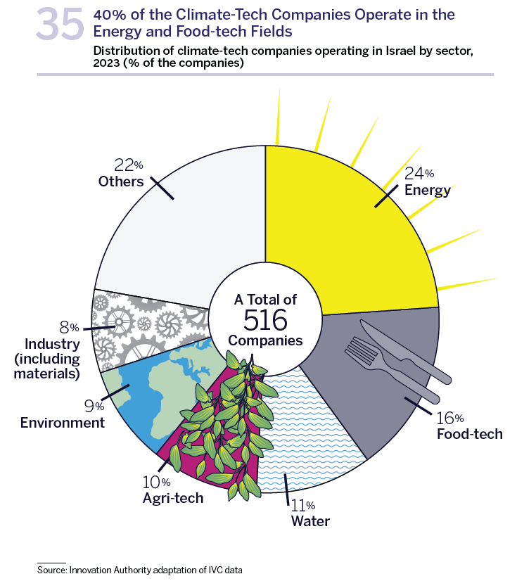 Furthermore, Israel is home to leading global research institutes in this field, including the Volcani Institute, the Soreq Nuclear Research Center, and the Weizmann Institute. These institutes and their researchers are responsible, among other things, for the development of innovative climate-tech solutions. A significant proportion of the climate-tech companies operating in Israel today, many of which have been established in recent years, is concentrated in fields to which government resources and efforts have been dedicated and where incentives have been given, including in the fields of energy (fuel substitutes), agriculture, and water.