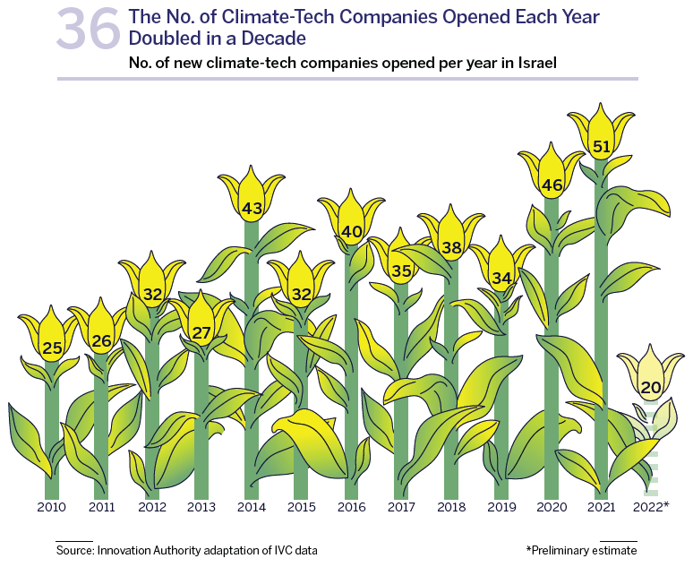The bottom line is that Israel enjoys a promising position as a key player in the development of revolutionary climate-tech solutions. This is, in part, thanks to the decades during which the young state was required to develop solutions in areas related to water, agriculture, and solar energy. Israel enjoys a positive worldwide reputation as one of the countries contributing to the global effort to develop technological solutions for the climate crisis. Today, Israel’s rich store of research knowledge and experience in this field constitutes a comparative advantage of the Israeli ecosystem in the climate-tech field over other countries. The rate of new companies being opened in Israel and of their fundraising has also grown significantly in recent years.