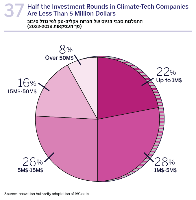 Alongside the increased rate of new climate-tech companies, the capital raised by climate-tech companies also increased significantly. According to the study, in the five years between 2018-2022, a total of 7.2 billion dollars was raised by 344 companies in the fields of climate-tech, 24% of which was by food-tech companies that raised 1.7 billion dollars. Of all the funding rounds in the various fields of climate-tech, half were by companies in early stages, with less than 5 million dollars raised in each round.