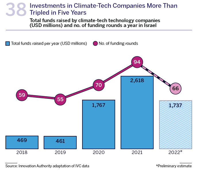 Among the prominent recent funding rounds in the Israeli climate-tech field were H2Pro that develops a green hydrogen technology and raised 75 million dollars in 2022; Beewise which raised 80 million dollars in 2022; and Remilk that raised 120 million dollars in 2022, a figure which, according to reports, reflected a total company value of 325 million dollars.