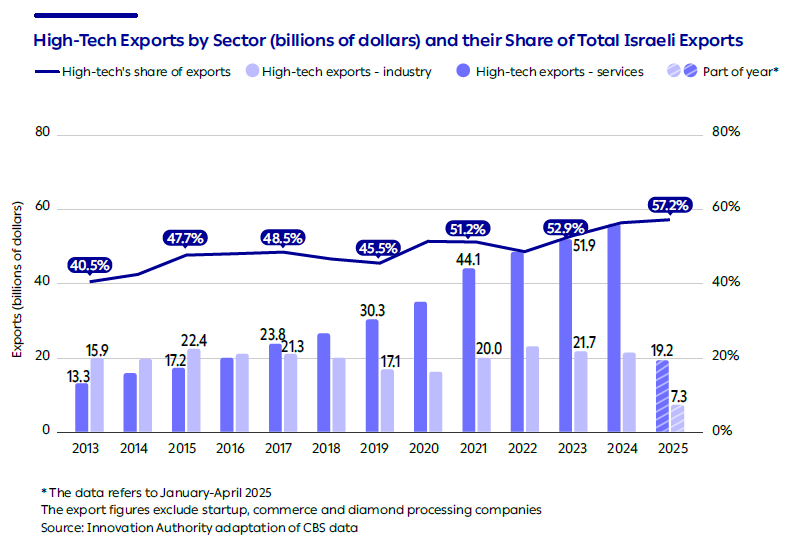 In the first four months of 2025, the share of high-tech exports out of total Israeli exports continued to grow, reaching 57.2% of all Israeli exports – the highest rate recorded after the figure of 56.4% for the whole of 2024.