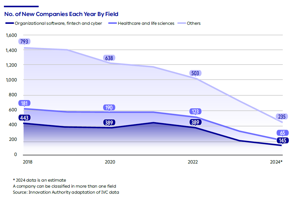 In the organizational software sector – the largest field in which new companies are established – there has been a decline in the number of new companies. For example, in 2018, about 240 new companies were established in this field, compared to around 130 in 2023. A further decline was registered in 2024 (although the number is expected to increase as data is updated).